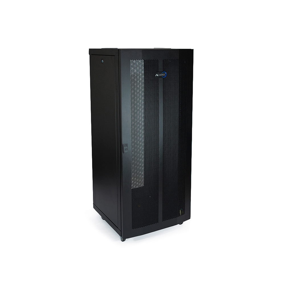 ■ Puerta frontal perforada total según norma EIA /TIA 942 y desmontable, cerradura de maneta con cierre de un punto, tapa posterior perforada total y desmontable, con cerradura de seguridad